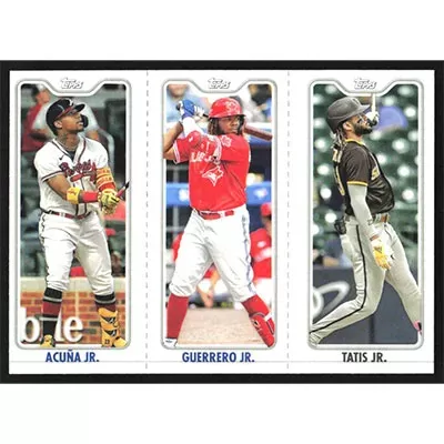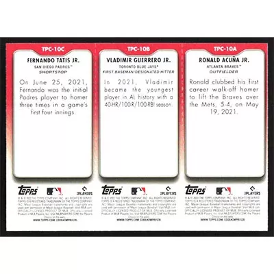 This is a 2022 Topps Opening Day Triple Play Ronald Acuña Jr., Vladimir Guerrero Jr. and Fernando Tatis Jr. baseball card. The card is #TPC-10A-C and pictures show condition.
