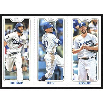 This is a 2022 Topps Opening Day Triple Play Cody Bellinger, Mookie Betts and Clayton Kershaw baseball card. The card is #TPC-3A-C and pictures show condition.
