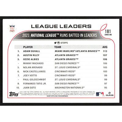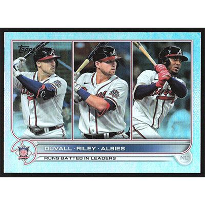 This is a 2022 Topps Rainbow Foil Adam Duvall, Austin Riley and Ozzie Albies League Leaders baseball card. The card is #181 and pictures show condition.