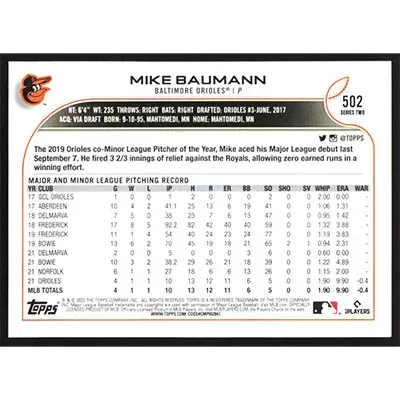 This is a 2022 Topps Rainbow Foil Mike Baumann baseball card. The card is #502 and pictures show condition. Team(s): Baltimore Orioles Rookie Card (RC)