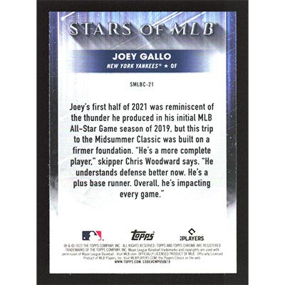 This is a 2022 Topps Stars of MLB Chrome Joey Gallo baseball card. The card is #SMLBC-21 and pictures show condition.