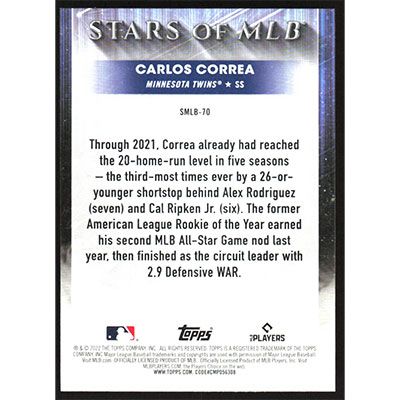 This is a 2022 Topps Stars of MLB Carlos Correa baseball card. The card is #SMLB-70 and pictures show condition.