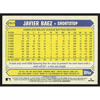 This is a 2022 Topps Update '87 Javier Baez baseball card. The card is #87TBU-19 and pictures show condition.