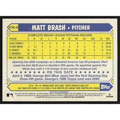 This is a 2022 Topps Update '87 Matt Brash baseball card. The card is #87TBU-43 and pictures show condition. Team(s): Seattle Mariners Rookie Card (RC)