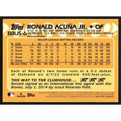This is a 2022 Topps Update '88 Ronald Acuña Jr. baseball card. The card is #88US-6 and pictures show condition.