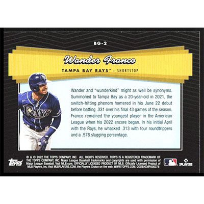 This is a 2022 Topps Update Black Gold Blue Wander Franco baseball card. The card is #BG-2 and pictures show condition. Team(s): Tampa Bay Rays Rookie Card (RC)