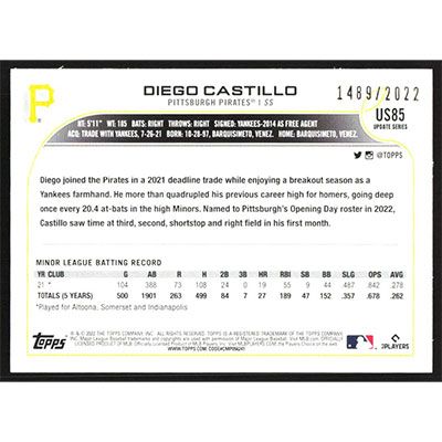 This is a 2022 Topps Update Gold Diego Castillo baseball card. The card is #US85 and pictures show condition. This card is limited; #'d 1489/2022. Team(s): Pittsburgh Pirates Rookie Card (RC)
