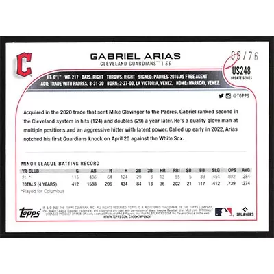 This is a 2022 Topps Update Independence Day Gabriel Arias baseball card. The card is #US248 and pictures show condition. This card is limited; #'d 08/76.