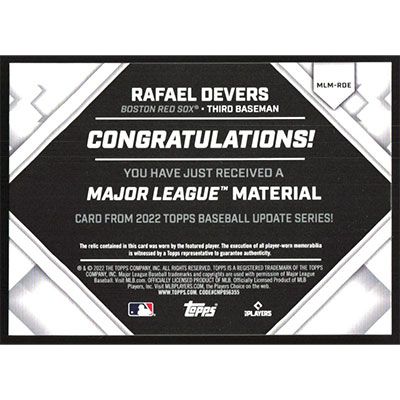 This is a 2022 Topps Update Major League Materials Rafael Devers Jersey baseball card. The card is #MLM-RDE and pictures show condition. Team(s): Boston Red Sox