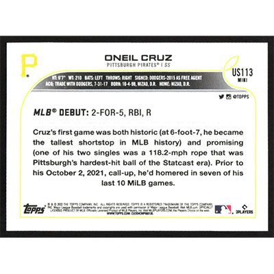 This is a 2022 Topps Update Mini Oneil Cruz Rookie Debut baseball card. The card is #US113 and pictures show condition. Team(s): Pittsburgh Pirates Rookie Card (RC)
