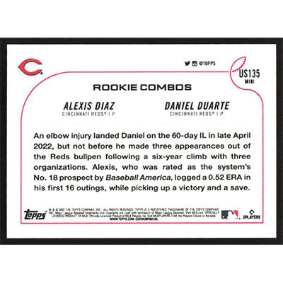 This is a 2022 Topps Update Mini Alexis Diaz and Daniel Duarte Rookie Combos baseball card. The card is #US135 and pictures show condition. Team(s): Cincinnati Reds Rookie Card (RC)