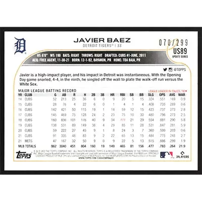 This is a 2022 Topps Update Orange Foil Javier Baez baseball card. The card is #US89 and pictures show condition. This card is limited; #'d 070/299. Team(s): Detroit Tigers