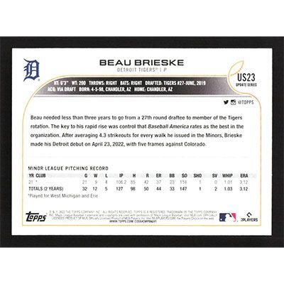 This is a 2022 Topps Update Rainbow Foil Beau Brieske baseball card. The card is #US23 and pictures show condition. Team(s): Detroit Tigers Rookie Card (RC)