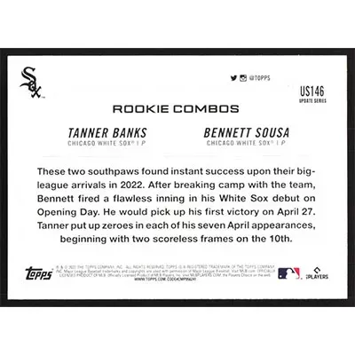 This is a 2022 Topps Update Royal Blue Tanner Banks and Bennett Sousa Rookie Combos baseball card. The card is #US146 and pictures show condition. Team(s): Chicago White Sox Rookie Card (RC)
