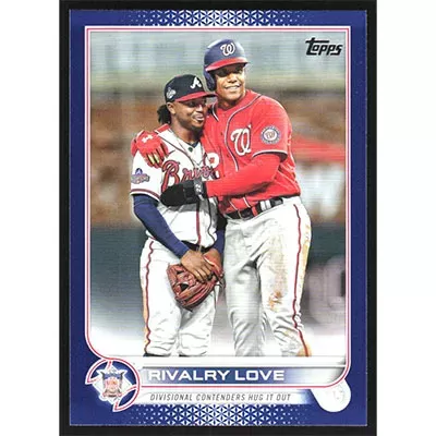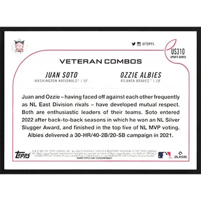 This is a 2022 Topps Update Royal Blue Ozzie Albies and Juan Soto Veteran Combos Rivalry Love baseball card. The card is #US310 and pictures show condition.