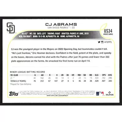 This is a 2022 Topps Update Royal Blue CJ Abrams baseball card. The card is #US34 and pictures show condition. Team(s): San Diego Padres Rookie Card (RC)