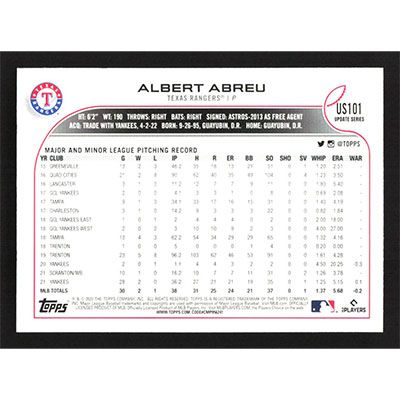 This is a 2022 Topps Update Albert Abreu baseball card. The card is #US101 and pictures show condition.