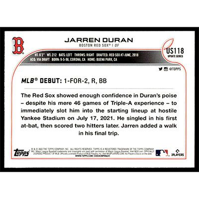 This is a 2022 Topps Update Jarren Duran Rookie Debut baseball card. The card is #US118 and pictures show condition. Team(s): Boston Red Sox Rookie Card (RC)