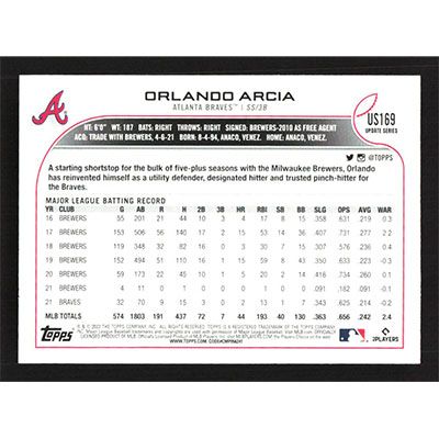 This is a 2022 Topps Update Orlando Arcia baseball card. The card is #US169 and pictures show condition.