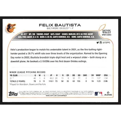 This is a 2022 Topps Update Felix Bautista baseball card. The card is #US225 and pictures show condition. Team(s): Baltimore Orioles Rookie Card (RC)