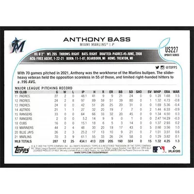 This is a 2022 Topps Update Anthony Bass baseball card. The card is #US227 and pictures show condition.