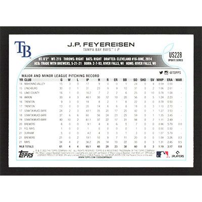 This is a 2022 Topps Update J.P. Feyereisen baseball card. The card is #US228 and pictures show condition.