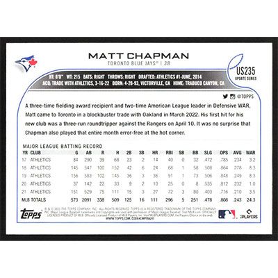 This is a 2022 Topps Update Matt Chapman baseball card. The card is #US235 and pictures show condition.