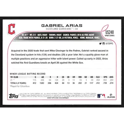 This is a 2022 Topps Update Gabriel Arias baseball card. The card is #US248 and pictures show condition. Team(s): Cleveland Guardians Rookie Card (RC)