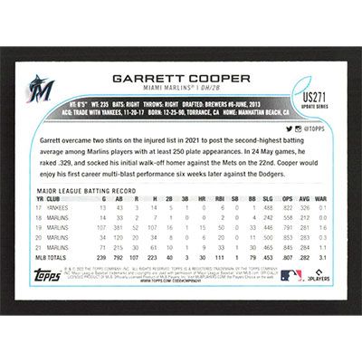 This is a 2022 Topps Update Garrett Cooper baseball card. The card is #US271 and pictures show condition.