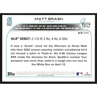 This is a 2022 Topps Update Matt Brash Rookie Debut baseball card. The card is #US274 and pictures show condition. Team(s): Seattle Mariners Rookie Card (RC)