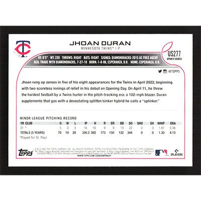 This is a 2022 Topps Update Jhoan Duran baseball card. The card is #US277 and pictures show condition.