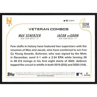 This is a 2022 Topps Update Jacob deGrom and Max Scherzer Veteran Combos Aces Up baseball card. The card is #US288 and pictures show condition. Team(s): New York Mets