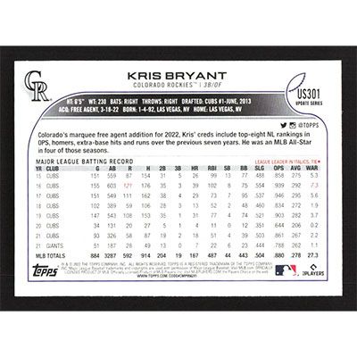 This is a 2022 Topps Update Kris Bryant baseball card. The card is #US301 and pictures show condition.