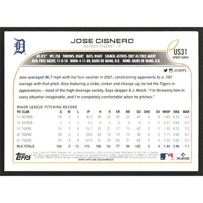 This is a 2022 Topps Update Jose Cisnero baseball card. The card is #US31 and pictures show condition.