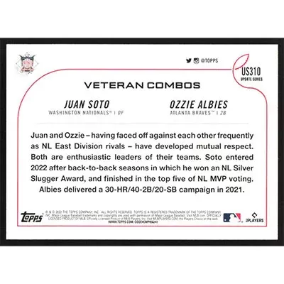 This is a 2022 Topps Update Ozzie Albies and Juan Soto Veteran Combos Rivalry Love baseball card. The card is #US310 and pictures show condition. Team(s): Atlanta Braves/Washington Nationals