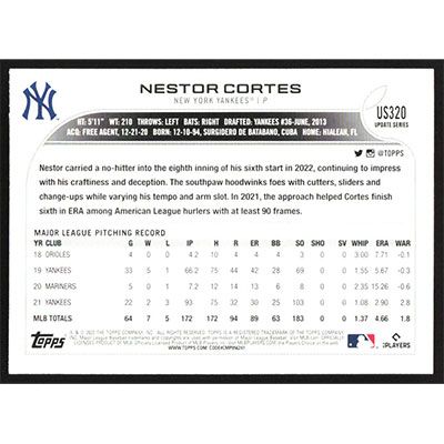 This is a 2022 Topps Update Nestor Cortes baseball card. The card is #US320 and pictures show condition.