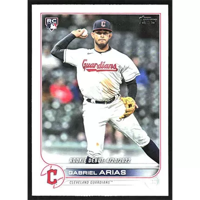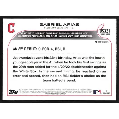 This is a 2022 Topps Update Gabriel Arias Rookie Debut baseball card. The card is #US321 and pictures show condition. Team(s): Cleveland Guardians Rookie Card (RC)