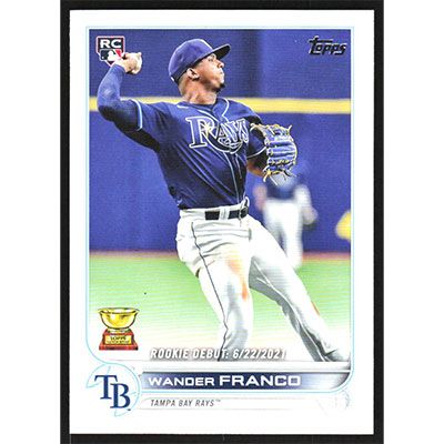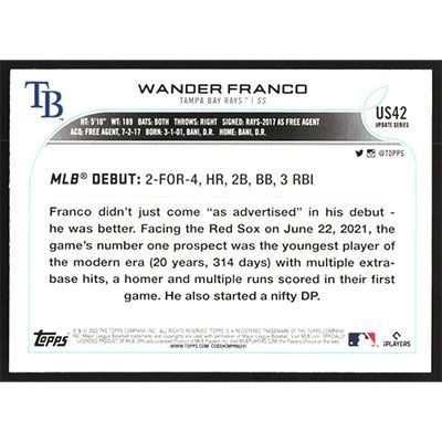 This is a 2022 Topps Update Wander Franco Rookie Debut baseball card. The card is #US42 and pictures show condition. Team(s): Tampa Bay Rays Rookie Card (RC)