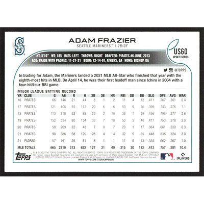 This is a 2022 Topps Update Adam Frazier baseball card. The card is #US60 and pictures show condition.