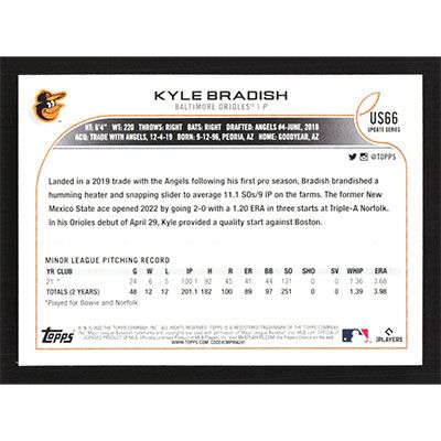 This is a 2022 Topps Update Kyle Bradish baseball card. The card is #US66 and pictures show condition.