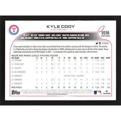 This is a 2022 Topps Update Kyle Cody baseball card. The card is #US96 and pictures show condition.