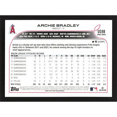 This is a 2022 Topps Update Archie Bradley baseball card. The card is #US98 and pictures show condition.