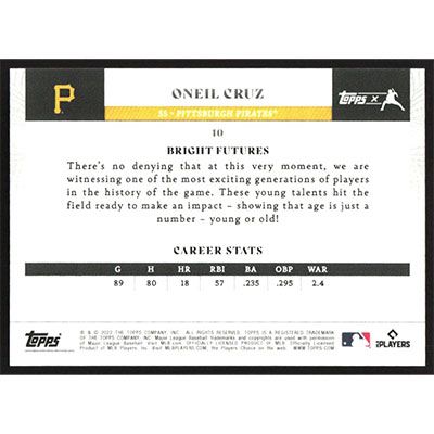 This is a 2022 Topps x Juan Soto Oneil Cruz baseball card. The card is #10 and pictures show condition. Team(s): Pittsburgh Pirates Rookie Card (RC)