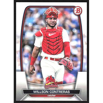 This is a 2023 Bowman Willson Contreras baseball card. The card is #100 and pictures show condition.