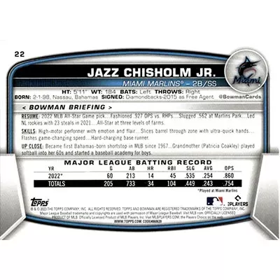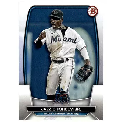 This is a 2023 Bowman Jazz Chisholm Jr. baseball card. The card is #22 and is in NM-MT condition.