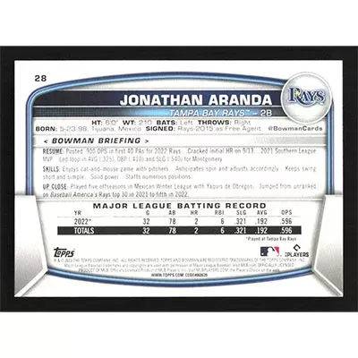 This is a 2023 Bowman Jonathan Aranda baseball card. The card is #28 and pictures show condition.