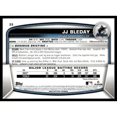 This is a 2023 Bowman JJ Bleday baseball card. The card is #33 and is in NM-MT condition.