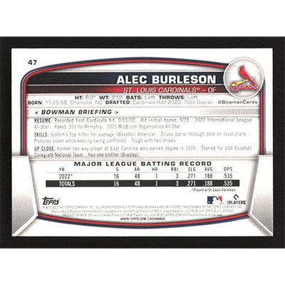 This is a 2023 Bowman Alec Burleson baseball card. The card is #47 and pictures show condition.