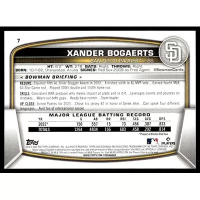 This is a 2023 Bowman Xander Bogaerts baseball card. The card is #7 and is in NM-MT condition.