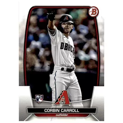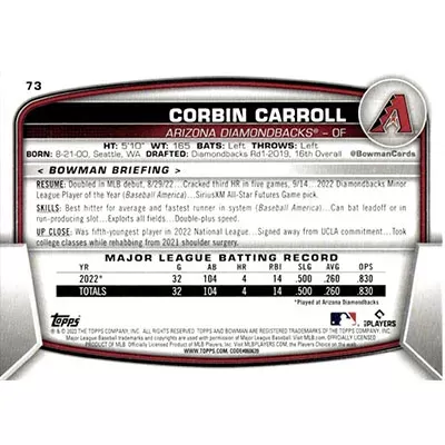This is a 2023 Bowman Corbin Carroll baseball card. The card is #73 and is in NM-MT condition.